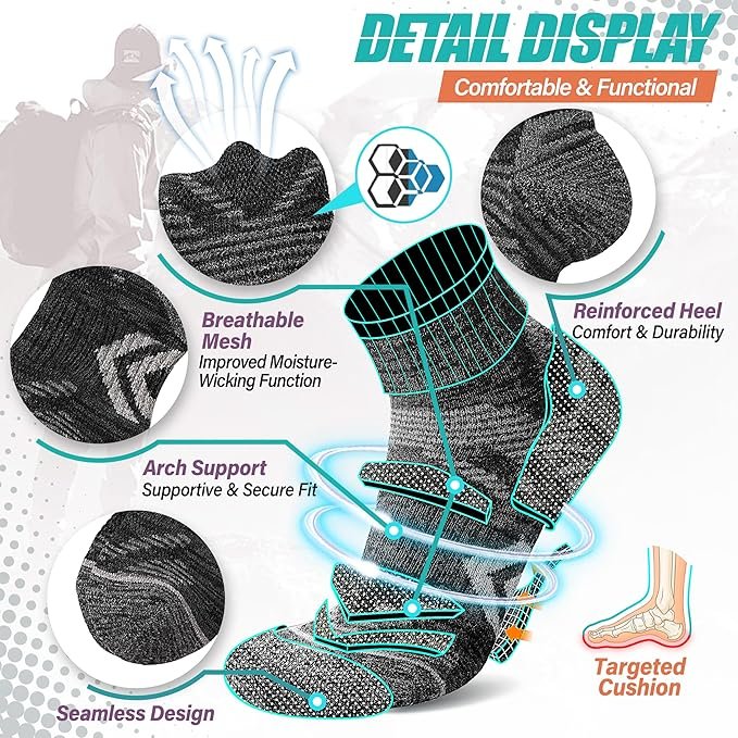 - Functional Support Design: Featuring compression stripes around the arch and ankle, paired with a stretchy top cuff, this design not only provides a snug fit that keeps the socks in place but also offers gentle arch support. Full-sole targeted cushioning absorbs impact, reducing shock during movement. This makes it ideal for both indoor workouts and outdoor activities like running and hiking
