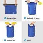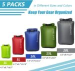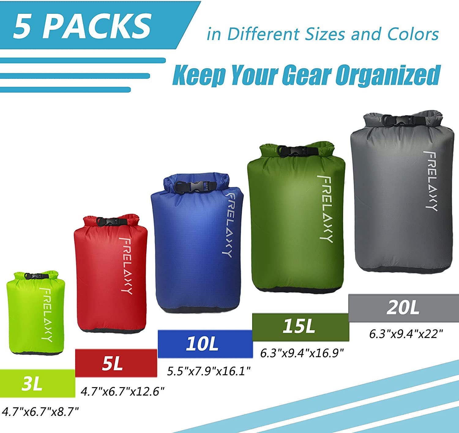 - Keep Your Gear Organized:A set of 5 ultralight Dry Sacks in Five Different Colors and Sizes (3L,5L,10L,15L,20L), so you can easily recognize the contents. Best design for food, clothes, hats, all of the outdoor gear.