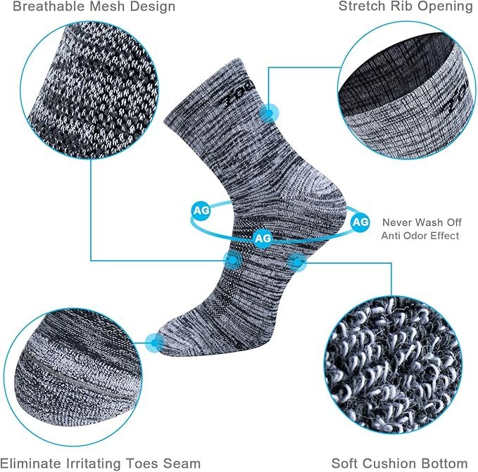 - Pack of 5 pairs padded quarter crew combed cotton anti odor socks with breathable mesh on the top of foot. Super soft cushion protects feet from injury and absorb sweat quickly to keep your feet dry.
