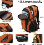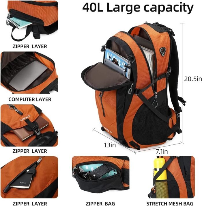 - Large Capacity & Multi Compartment Bookbag: Outdoor Backpack with 40L storage space(20.5inch x 13inch x 7.1inch), this backpack features with multi-compartment design includes one main zipped compartment, one zipped front pockets and two side pockets. One separator and one small zippered pocket in the main compartment are convenient enough to help you further organize things.Large capacity helps you easily organize all your essential items.
